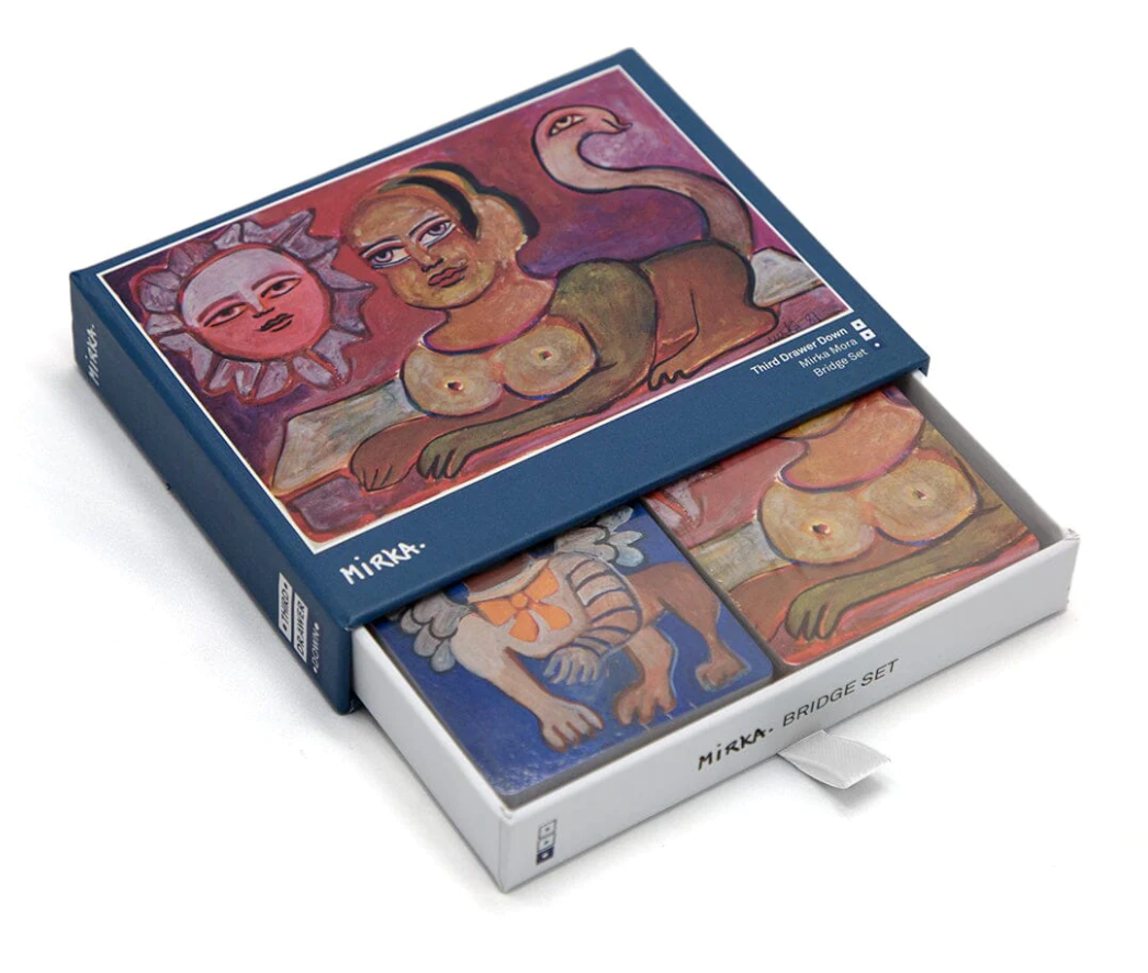 Sit down to a game of bridge, snap, go fish, anything you can imagine. Mirka Mora was one of Melbourne’s most imaginative and treasured artists, this bridge set is a spectacular way to bring art into the home, play with adults, learn with children and celebrate the artist. Includes two 52 card decks with the artwork of Mirka Mora.
