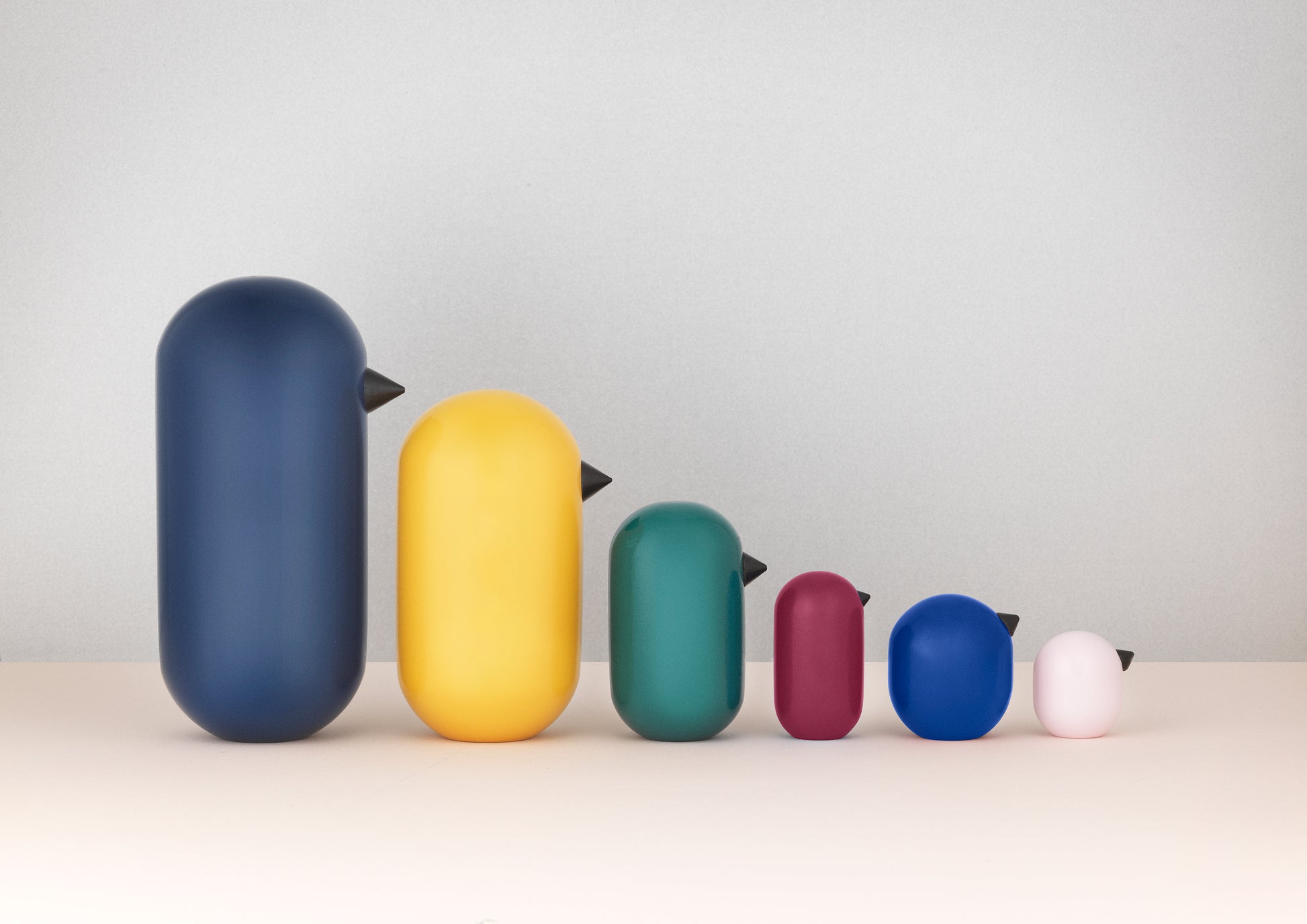 Little Bird is turned from solid oak or walnut and is lacquered or painted.