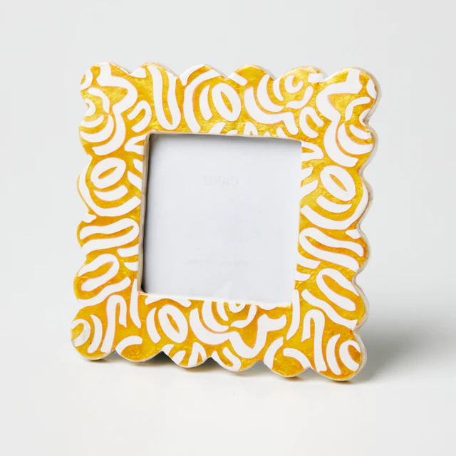 Our first-ever photo frame. Handmade with layers of capiz shell, then hand-painted and sealed, it features free-form white squiggles on a golden yellow base. Hang on a wall or place on a desk or table. Fits a square 9cm photo. The perfect grab-and-go gift. Designed in Sydney and hand-crafted in the Philippines by Jones & Co artisans.
